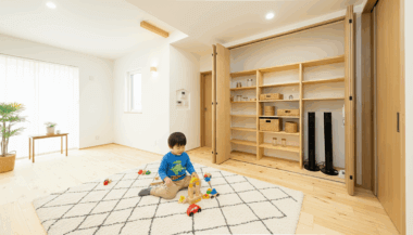 - ・0歳期(安全確保):細々したおもちゃは、造作の扉付き収納内に、さらにフタ付きのボックスに入れて二重ガードをしましょう。リビングで使うのは大型のソフトトイなどに限定します。