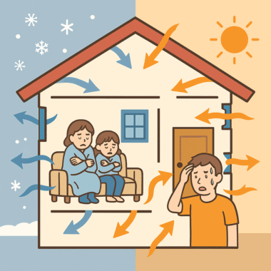 低性能な家: 帰宅後、冷え切ったり熱された壁や床を、一から温めたり冷やす必要があるため、エアコンがフル稼働し、電気代が高くなります。