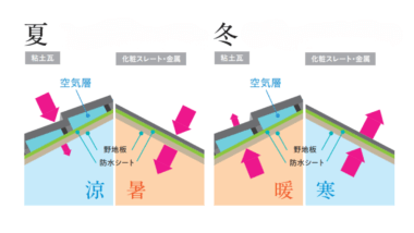 瓦と屋根下地(野地板)の間に空間があるため、熱が直接屋内に伝わるのを防いでくれます。